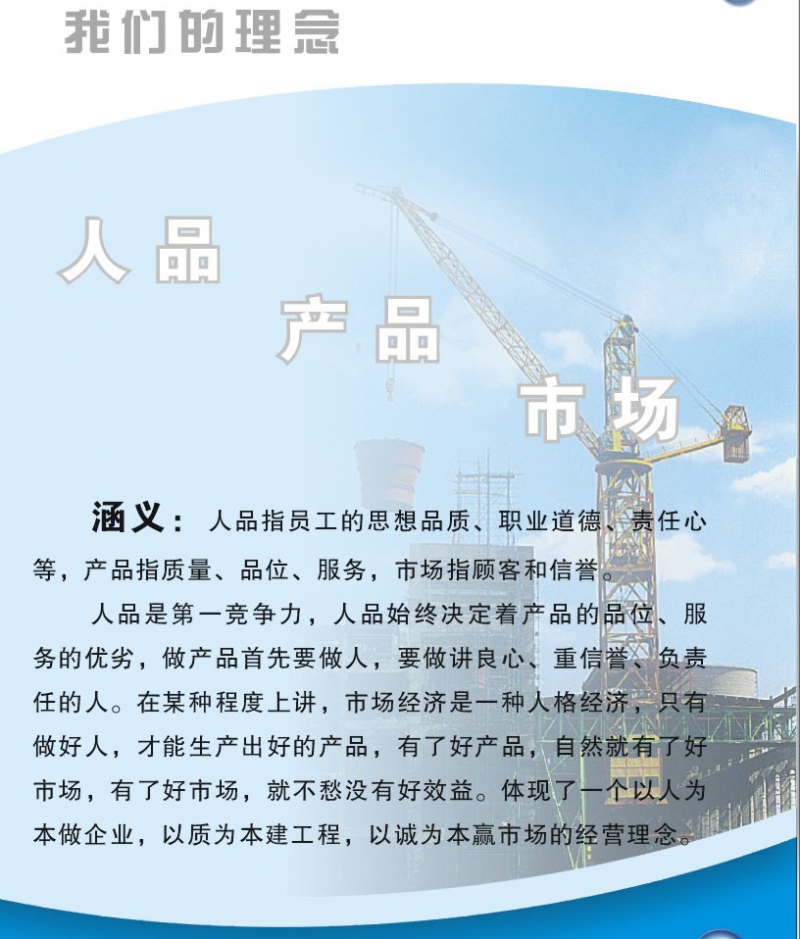 人品是第一競爭力,人品始終決定著產(chǎn)品的品位,服務(wù)的優(yōu)劣,做產(chǎn)品首先要做人,要做講良心、重信譽(yù)、負(fù)責(zé)任的人,在某種程度上講,市場經(jīng)濟(jì)是一種人格經(jīng)濟(jì),只有做好人,才能生產(chǎn)出好的產(chǎn)品,有了好產(chǎn)品,自然就有了好市場,有了好市場,就不愁沒有好效益。體現(xiàn)了一個(gè)以人為本做企業(yè),以質(zhì)為本建工程,以誠為本贏市場的經(jīng)營理念。