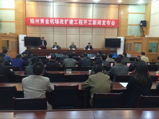 市政府召開贛州黃金機場改擴建工程開工新聞發(fā)布會。圖為發(fā)布會現(xiàn)場。